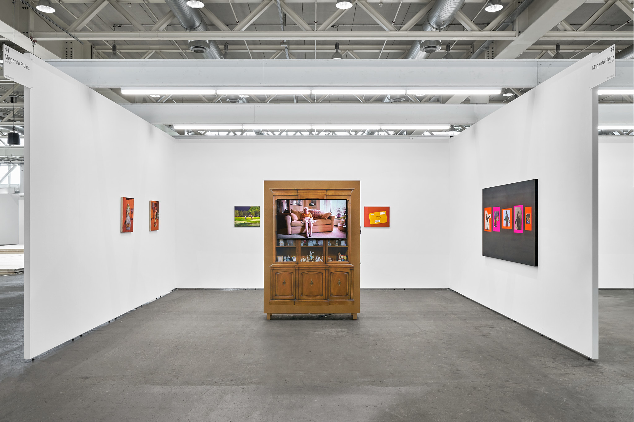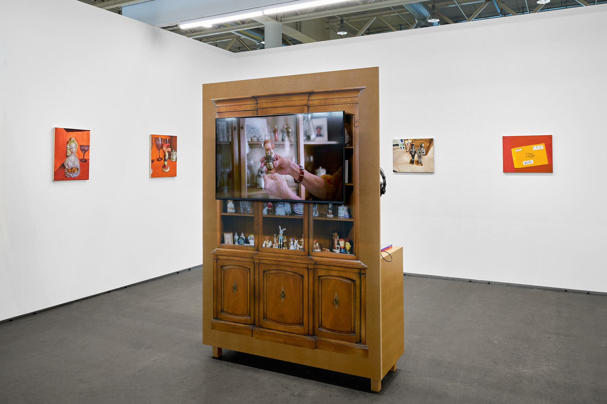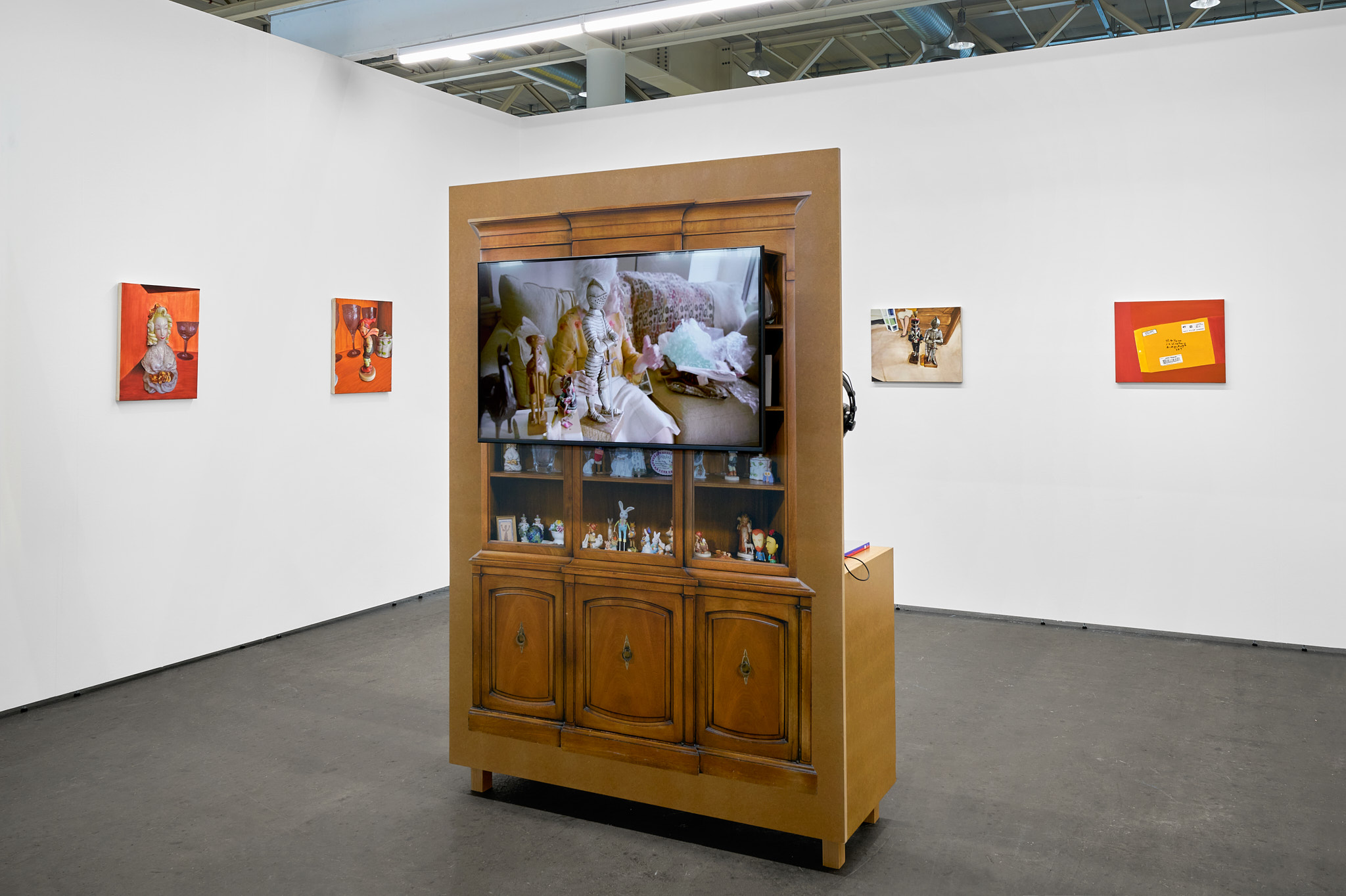 Matt Keegan, with shelves or drawers for storing or displaying, 2025, Clear-coat finished MDF, TV monitor, video, 76 3/4 x 52 3/4 x 17 3/4 in.